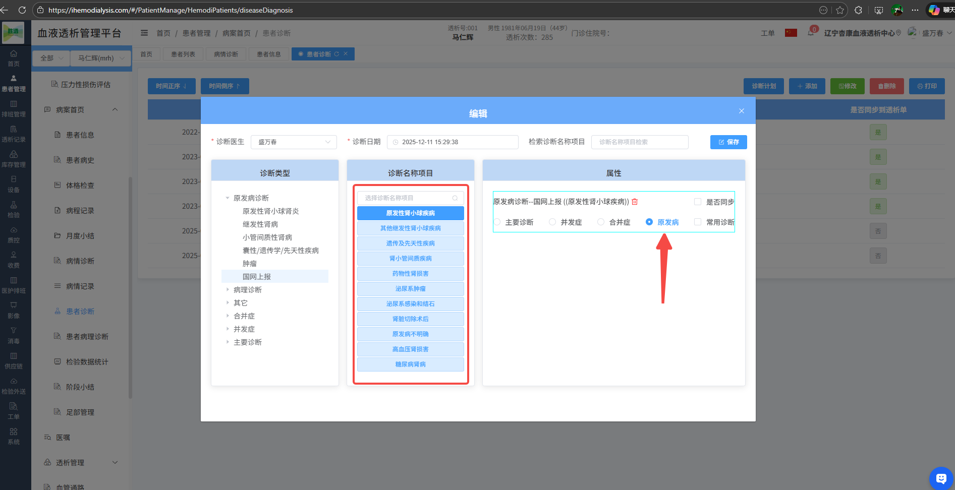 在胜透中找到患者诊断,国网上报,右侧所列的蓝色疾病名称列表中对应的疾病名称,即为与国网完全一致的名称,每个患者**至少要增加一条此类的国网原发病**,属性要选择**原发病**,然后点**保存**。