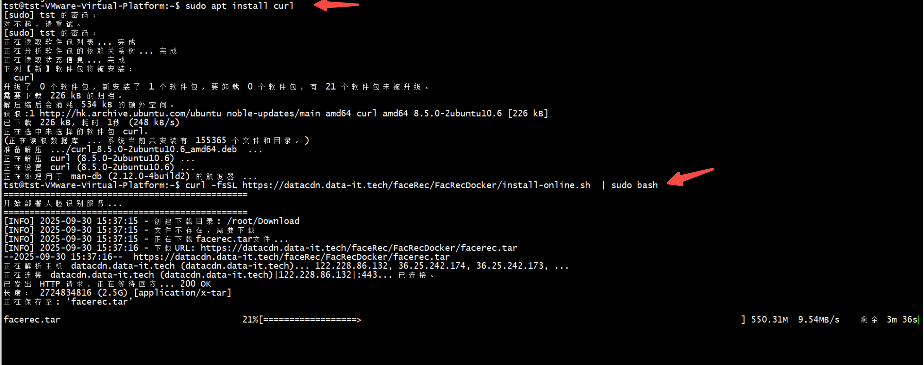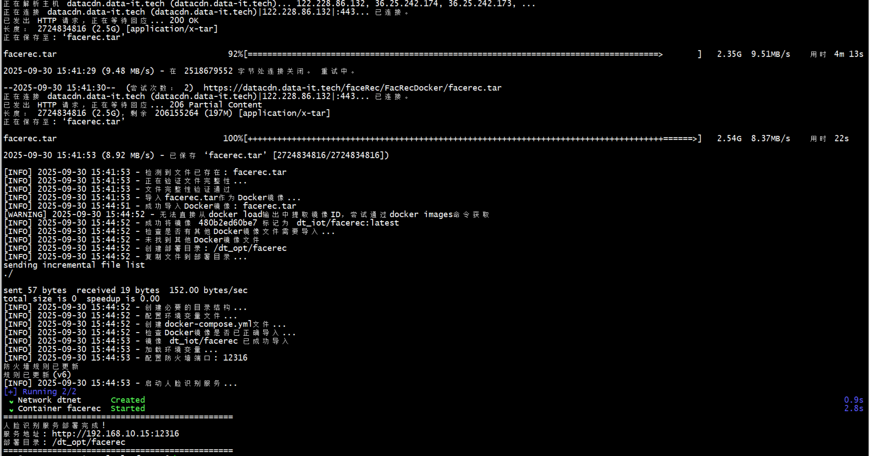 命令执行后,系统会自动下载并安装所需的Docker镜像和配置文件,整个过程可能需要几分钟时间,请耐心等待。