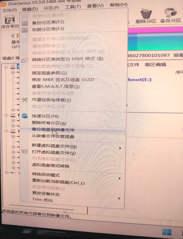 用winPE引导U盘,引导系统,进入PE,启动SiskGenius 分区助手程序,选中要操作的磁盘.然后,点击 菜单 磁盘