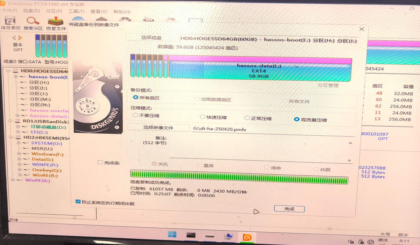 大约半个多小时,能写入完成.如下图所示,映像文件已生成约有5G,保存到合适的地方,可以用来装机或还原用。